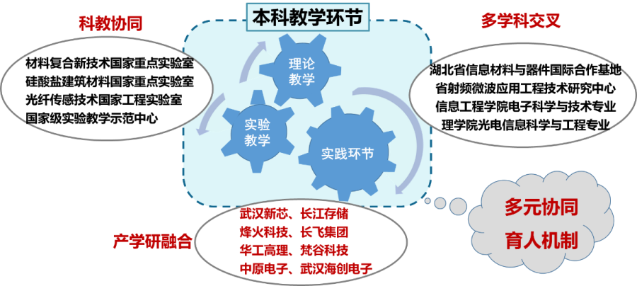 专业依托3个国家级科研基地(材料复合新技术国家重点实验室、硅酸盐建筑材料国家重点实验室和光纤传感技术国家工程实验室),4个“111”学科创新引智基地和2个国家级国际联合实验室,协同推进卓越人才培养。发挥具有国际领先水平的信息功能材料制备及器件组装成套设备、光电器件测试平台、光纤器件测试平台等在材料精确制备与表征、器件研发与应用研究的育人功能,促进科研成果向课程教学、本科实验项目、老员工创新创业训练项目等转化。