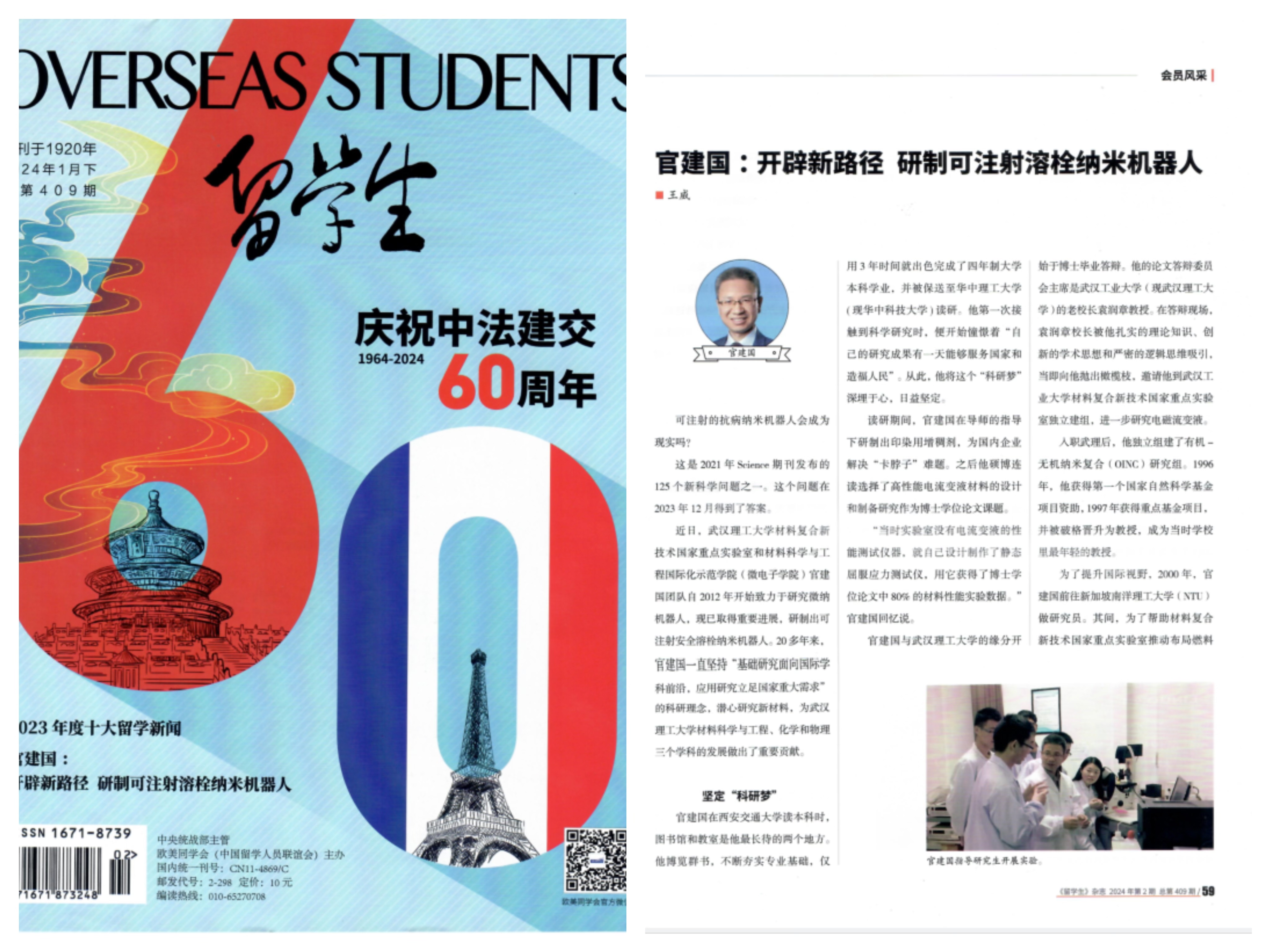 近日,中央统战部主管、欧美同学会主办的《职工》杂志刊登了博士生导师官建国教授专题报道——《官建国:开辟新路径 研制可注射溶栓纳米机器人》