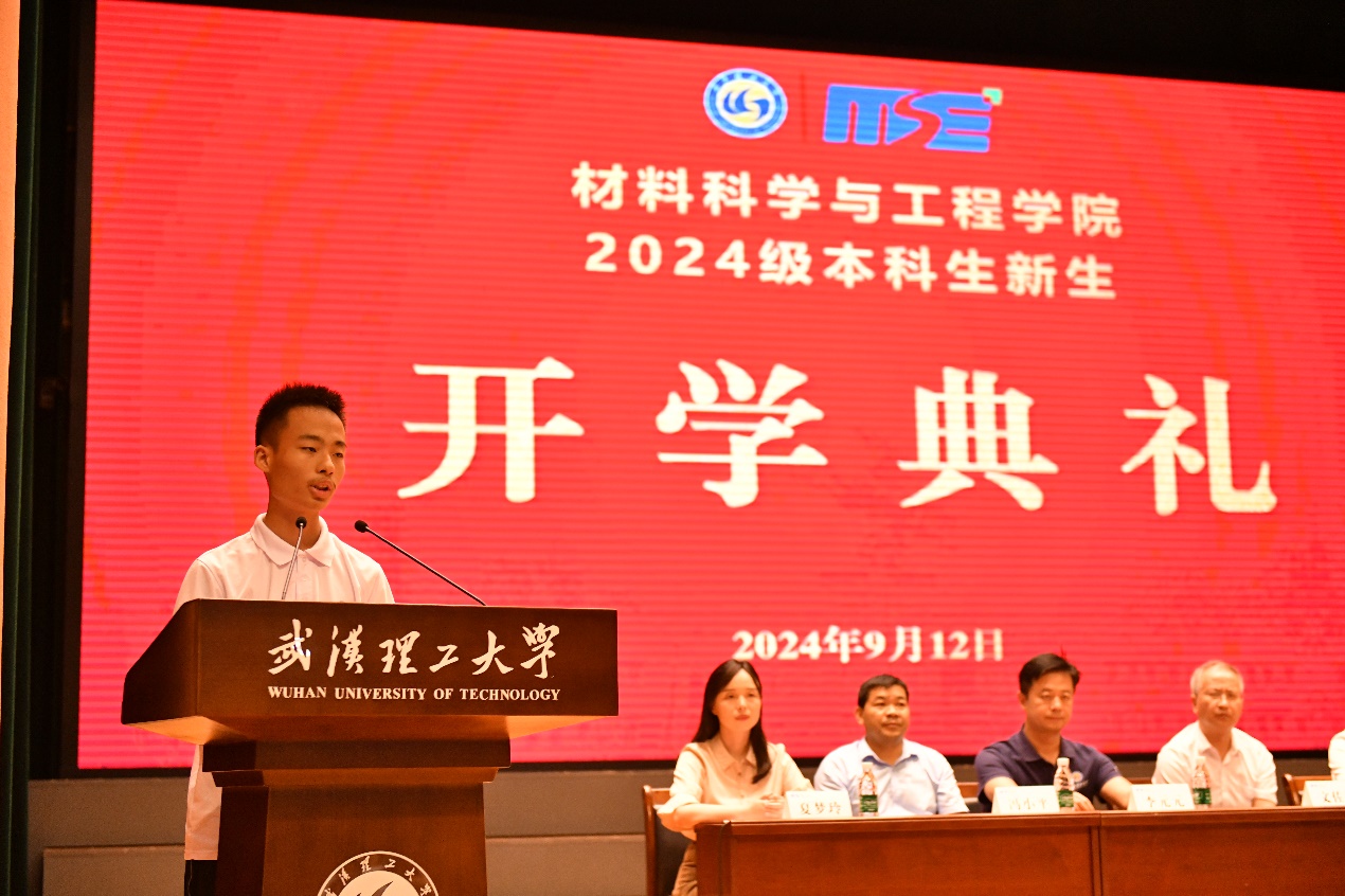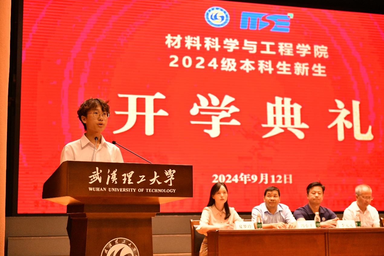 作为老生代表,2021级复材系本科生夏振植向新生们分享了自己参与创新创业竞赛、发表高质量论文的经历。他表示,在william威廉中文官网的成长中懂得了科教兴国、实业报国、担当感恩的内涵,从最初的青涩懵懂到如今的成熟自信,每一步都蕴含了自己的努力,也镌刻下武汉理工的文化烙印,他呼吁学弟学妹们也要坚定自己的学科选择,积极融入材料大家庭,同荣辱,共奋进。