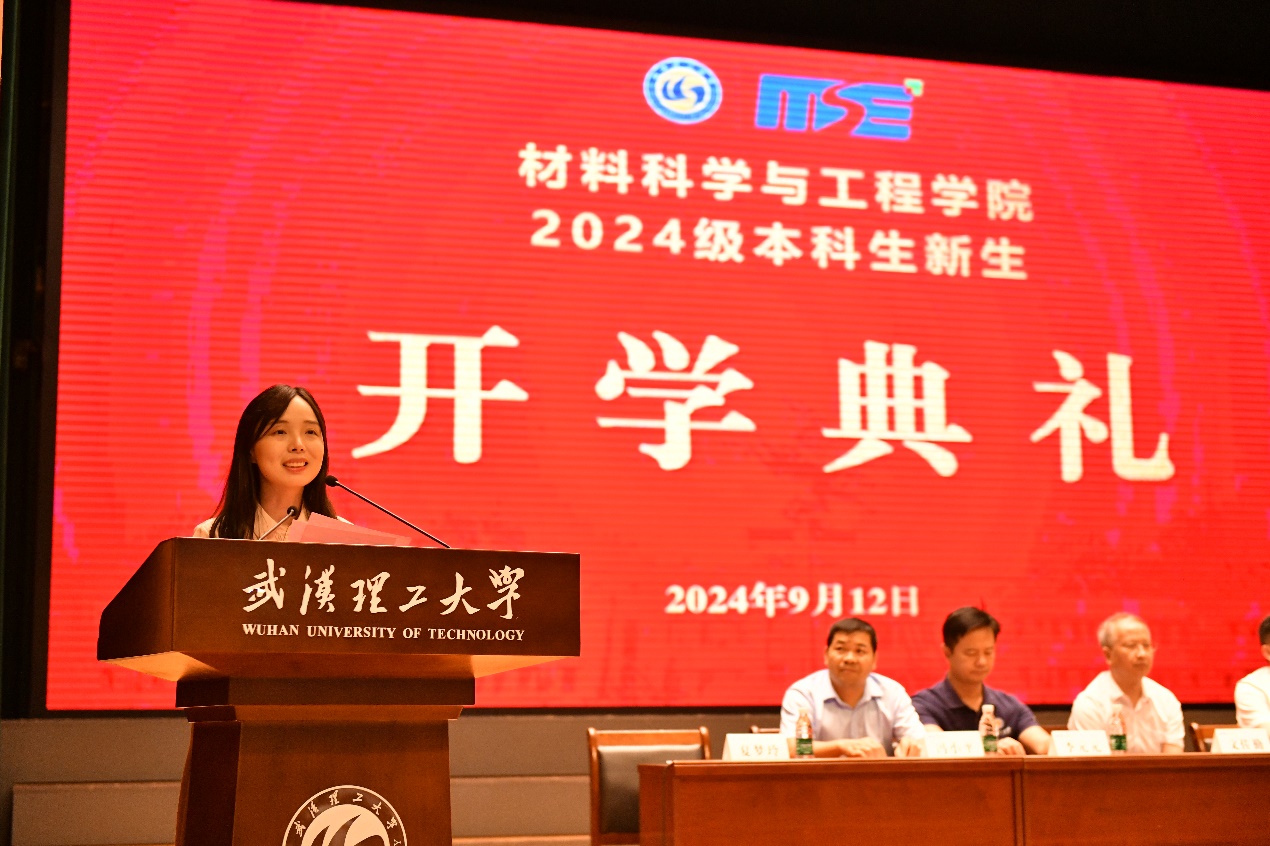 教师代表夏梦玲讲述了自己砥砺奋进,勤勉求学的经历,并向新生分享了自己的成长心得感悟。她表示,材料是科技发展的基石,对新能源汽车、5G芯片、太阳能电池等国家战略性新兴行业有支撑作用,同学们要坚信自己的选择,凝聚专业认同。另外,要在追求卓越的道路上坚持不懈,积累日复一日的进步与满足,并学会用包容的态度聆听不同的声音与意见,以积极的心态去面对生活中的挫折与困难。夏老师衷心祝愿新生们可以在大学收获知识与友谊,共同为中华民族伟大复兴贡献力量。