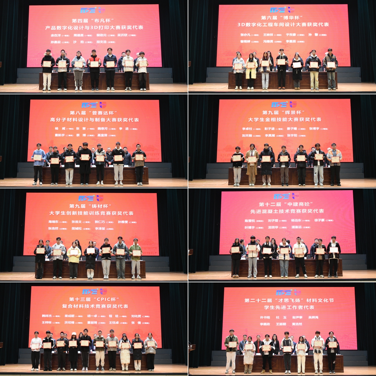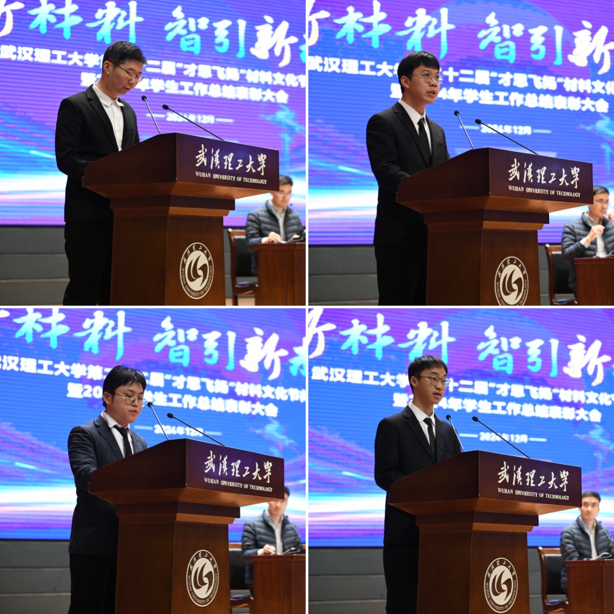 材料文化节优秀员工干部代表刘谨睿、校卓越奖学金获得者、校三好员工标兵代表傅杰、校标兵班集体代表夏柯鹏、社会奖学金获奖代表马常宁依次上台发言。他们分享了成长的故事与感悟,希望材料学子在践行材料梦的过程中,坚持传承创新、主动挺膺担当、不负伟大时代。