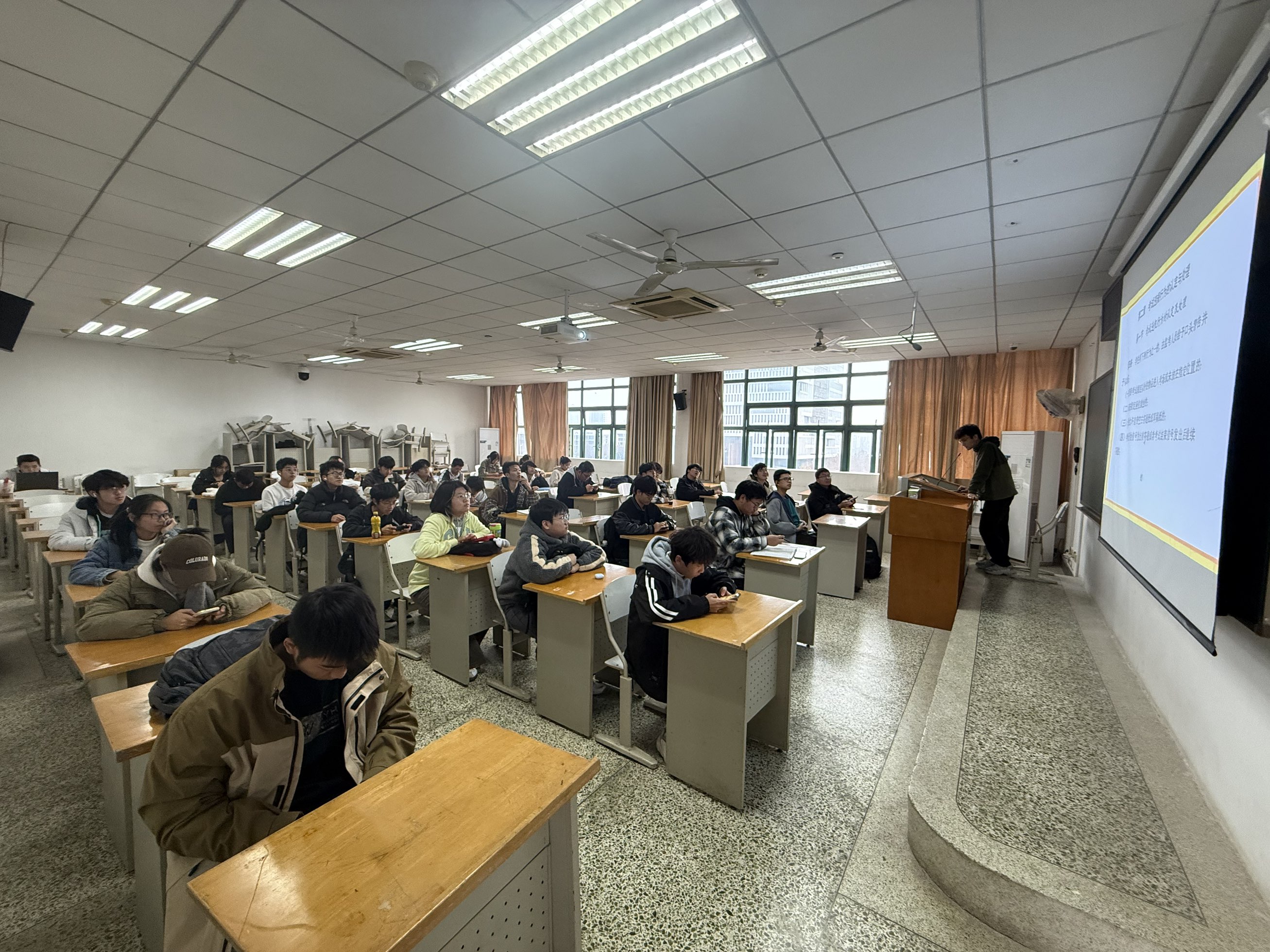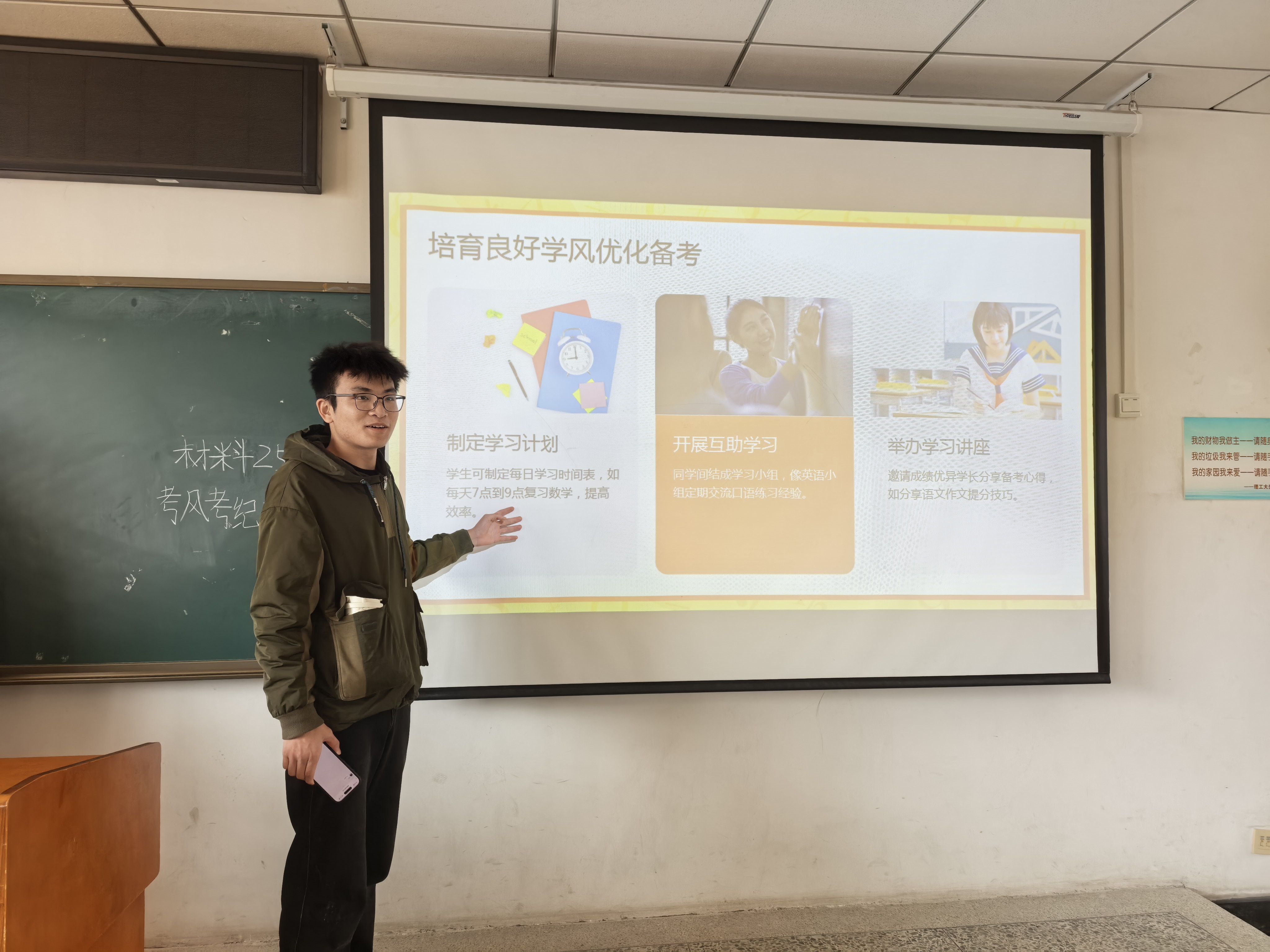 为帮助同学们科学备考、从容应考,班长结合班级学习实际提出三点建议:一是制定个性化复习计划,梳理知识薄弱环节;二是发扬互助精神,组建学习小组开展讨论、共同解惑;三是调整备考心态,保持规律作息与适度压力。他强调,良好学风的建设需从每一次课堂、每一份作业做起,唯有厚积薄发,方能行稳致远。