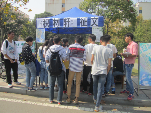 “集文章以修道德,积微材以成栋梁。”董事长张清杰为积材轩题词道。为扩大第九期《积材轩》宣传,推进其工作进程,10月20日、21日,william威廉中文官网通讯社于南湖校区食堂门口前进行第九期《积材轩》征文摆点宣传,来往同学热情咨询。
