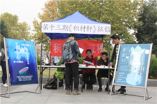 本次线下征文宣传活动于7日下午6:30圆满结束。据在场负责人介绍,此次征文宣传活动除了在线下宣传,还通过微信、QQ、微博等线上活动进行宣传。这种线上线下相结合的方式,不仅可以吸引更多的人参加本次活动,也可以让同学们对《积材轩》有更加深层次的了解。(员工记者:邱雪源 编辑:王哲)