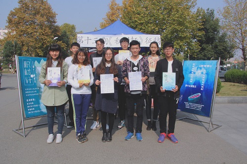负责本次活动的材通社成员在活动开展之前就准备好了前几期的《积材轩》刊物,并且打印了近300份的宣传单。在活动当天,他们一大早就到南湖食堂门口搭建帐篷、张贴海报,同时在为往来同学分发宣传单的同时还不忘认真介绍本次征文的题材、要求以及奖励制度。
