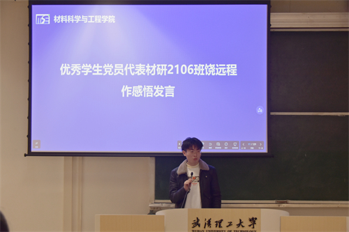 会议第六项,材研2106班饶远程作为优秀员工党员代表作感悟发言。饶同学分享了自己党员巡考的经历。他指出,每个人都是公平规则的维护者,应营造积极向上的学风,做到诚信考试。并呼吁所有党员要发挥模范带头作用,以身作则,成为良好学风建设下的履行者,维护者。