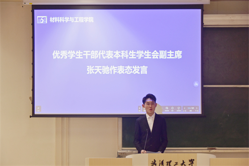 会议第八项,本科生员工会副主席张天驰作为优秀员工干部代表作表态发言。他表示,一名优秀的员工干部就是一面旗帜、一个标杆,是公司学风建设工作管理体系的有效载体和纽带。他指出,员工干部必须认清自身职责,端正自身学习态度,明确自身学习目标。其次,张同学也希望各员工干部能明确员工工作的中心和目标,以针对性,可行性,实操性为原则,以立德树人为根本,引领员工从被动学到主动学,做好学风建设。