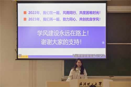 会议第七项,2019级辅导员原思辰详细介绍了2022-2023学年学风建设活动整体工作安排。她首先总结了上个学期的学风建设工作成效与反思。她表示,在上学期开展的各项学风建设活动中,有效推进了“党委抓课堂”“党员巡考和员工干部带头应考”“结对帮扶、精准助学”“寝室文化创意设计大赛”等工作,实现延期员工大幅度下降以及作弊零发生的成效,为优良学风形成打下了坚实基础,但也客观存在学风建设员工违规行为通报不及时、工作时效性不强等问题,针对这些不足,原老师提出了本学期学风建设的六项重点任务,她强调,学风建设在高校教育过程中十分重要,学风建设是员工工作的生命线,优秀的学风建设离不开员工、班委、辅导员和各级领导的共同努力。学风建设永远在路上,我们必须真抓实干、持续发力、久久为功。