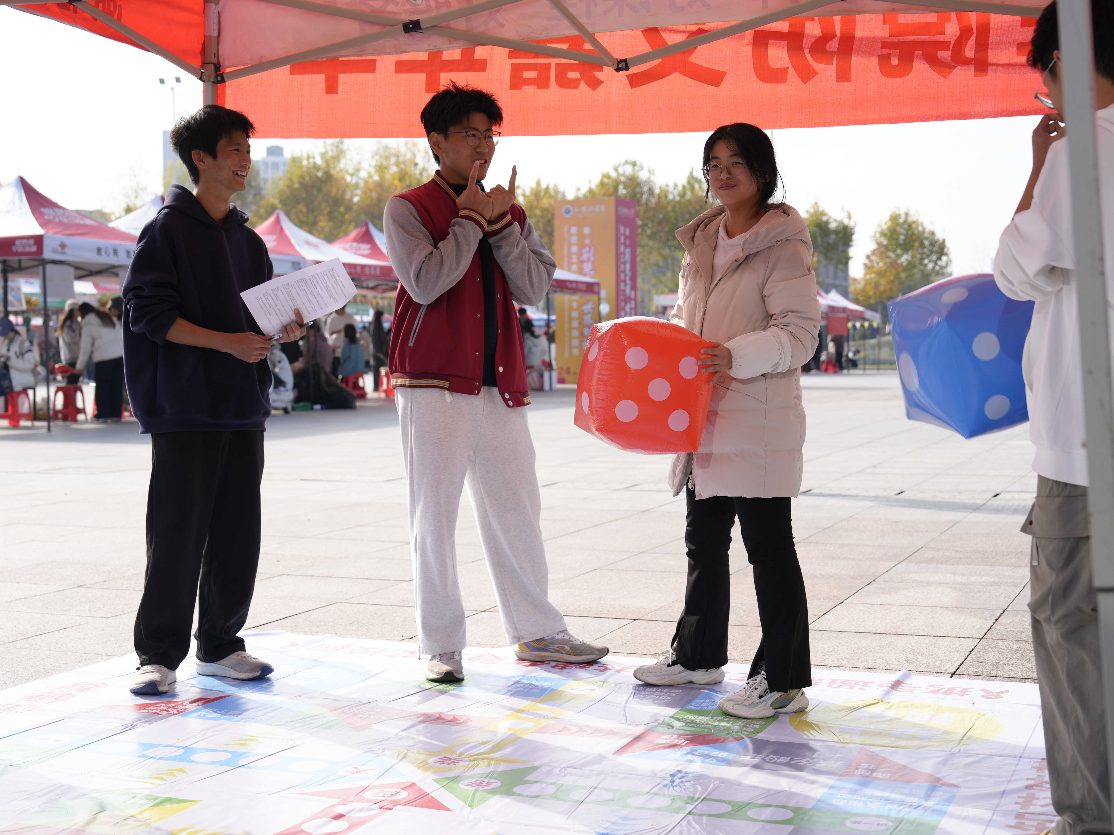 活动现场,巨型棋盘吸引了不少同学驻足参与。参与者扮演“棋子”,通过投掷骰子在棋盘上行进,每前进一步都需回答相应的防艾知识问题,志愿者则从旁进行判断与讲解。一旁的“盲盒知艾问答”同样气氛热烈,同学们通过抽取盲盒中的题目进行互动答题,一问一答之间,防艾知识逐渐深入人心。整场活动氛围轻松活泼,同学们在欢声笑语中学习了重要的健康知识。
