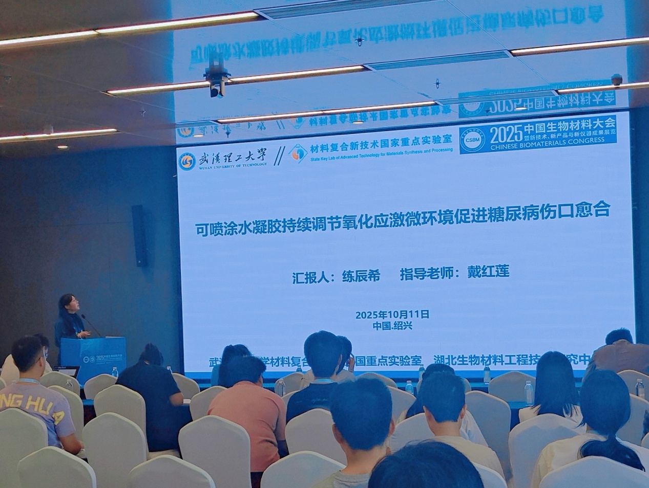 william威廉中文官网练辰希作了题为“可喷涂水凝胶持续调节氧化应激微环境促进糖尿病伤口愈合”的口头报告。报告阐明了调节氧化应激微环境对促进糖尿病伤口愈合的重要性,提出了一种通过镁-没食子酸金属有机框架持续调节氧化应激微环境的策略,并基于海藻酸钠/壳聚糖季铵盐开发了可喷涂水凝胶敷料来治疗糖尿病伤口。该策略中利用微波辅助合成技术优化bio-MOF的合成方法,提高其水中稳定性及清除活性氧自由基效率,实现了bio-MOF合成-结构-性能之间的有效调控。体内外实验证实了可喷涂水凝胶敷料持续调节氧化应激微环境的同时通过Mg2+辅助治疗激活血管相关基因的表达来促进血管再生和神经元形成。